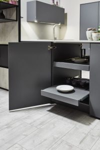 De keuken heeft een drietal accessoires voor aan de woonzijde van de keuken waardoor het kookeiland in een meubelstuk veranderd. De trolley kan bijvoorbeeld naar de bank worden gerold tijdens een ontspannen tv-avondje. De uittrekbare planken zorgen ervoor dat je aan de eetkamerkant gemakkelijk bij het servies kunt. En de Open Style wandkast is een verstelbaar modulair systeem die ook in andere delen van het huis gebruikt kan worden, zoals de badkamer.
