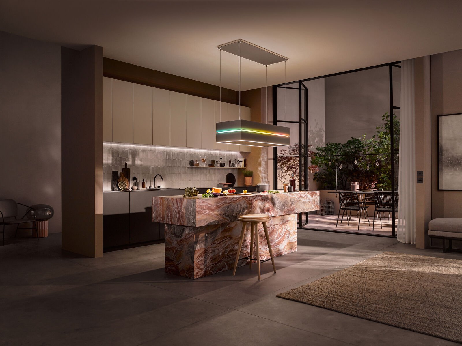 Naast handgebaren kun je het apparaat ook bedienen met de berbel+ app. Voor een individuele look van de Skyline Edge Play eilandkap zijn er verschillende plafondplaten van rvs of glas in verschillende kleuren verkrijgbaar.