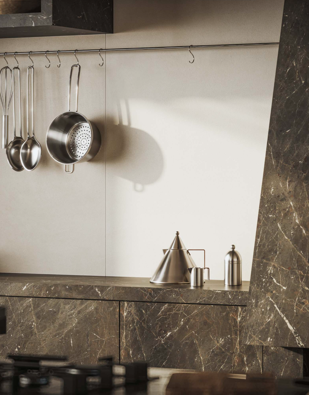 “Ik houd niet van keukens die alleen mooi zijn zolang ze leeg zijn, en hun charme verliezen zodra je er echt in kookt. Daarmee raak je de essentie kwijt: de keuken moet in de eerste plaats een plek zijn waar de liefde voor eten en samenzijn gevierd wordt. Of de ruimte nu minimalistisch is of vol spullen staat, ze moet altijd vreugde uitstralen en de schoonheid weerspiegelen van wat erbinnen gebeurt.”