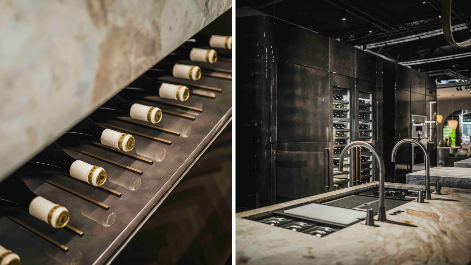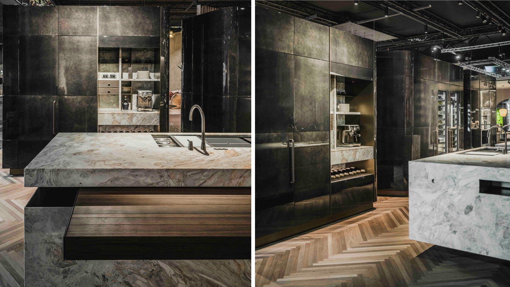 Tot slot zitten in de marmeren werkeilanden uitkepingen, zodat de bar kan bewegen en draaien. Deze zijn bekleed met massief laiton fummé, ofwel gerookt messing. Dit materiaal is ook gebruikt voor het onderstel en de lades.