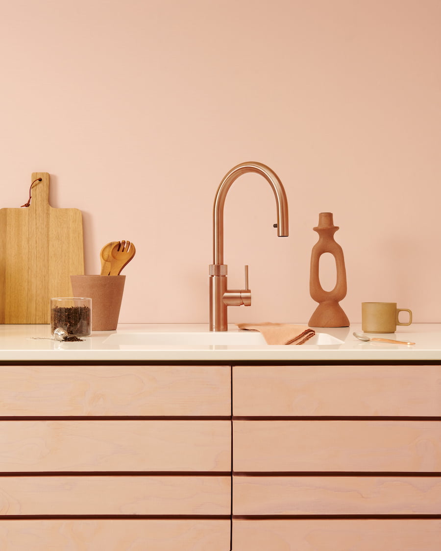 Het Rosé Koper is goed te combineren met een licht, Scandinavisch kleurenpalet, vertelt de fabrikant. “Maar deze kleur kan in een andere setting juist voor een vintage sfeer zorgen.”