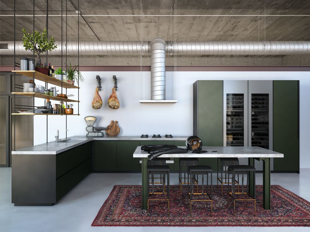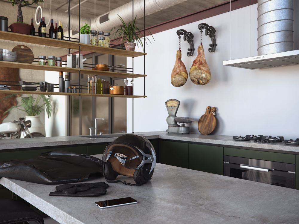 De aders in de tekening lijken op fijne scheurtjes die je ook wel vindt in betonvloeren. In de sfeerfoto’s die Dekton heeft laten maken is het werkblad gecombineerd met donkergroene houten keukenkastjes en robuuste rvs spoelbakken, kranen en keukenapparatuur. De open schappen geven de keuken een ruimtelijk karakter.