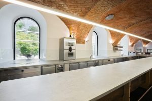 De keuze van het oppervlaktemateriaal voor de keukenwerkbladen was zeker geen sinecure. Het moest er aantrekkelijk uitzien, maar absoluut ook de vereiste prestatiekwaliteiten bezitten. Amador vertelt: “Het belangrijkste, zeker bij dit project, is dat het oppervlak handig in het gebruik is. Het moet echt ongelooflijk stabiel blijven onder de fysieke beproevingen van een professionele keuken en het moet robuust genoeg zijn om extreme temperatuurschommelingen te weerstaan. Het oppervlak moet verder onderhoudsarm en ultra-hygiënisch zijn, en gemakkelijk schoon te maken.”
