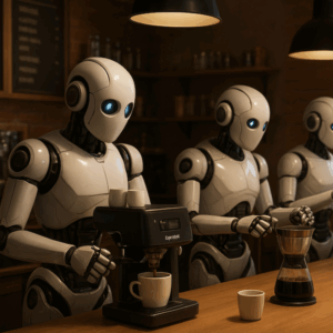 Echte robotbarista’s, die zien we nog niet thuis. Denk aan twee robotarmen die een hartje van melk in je cappuccino schenken. Maar opmerkelijk genoeg zien we ze al wel steeds meer in de zakelijke markt. En dat brengt een interessant dilemma met zich mee.