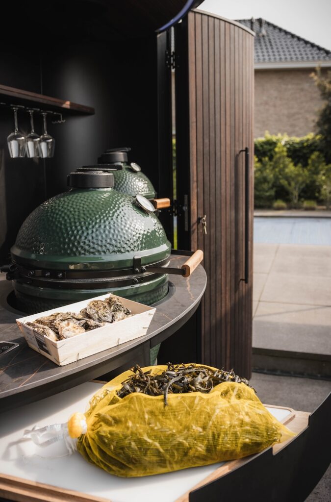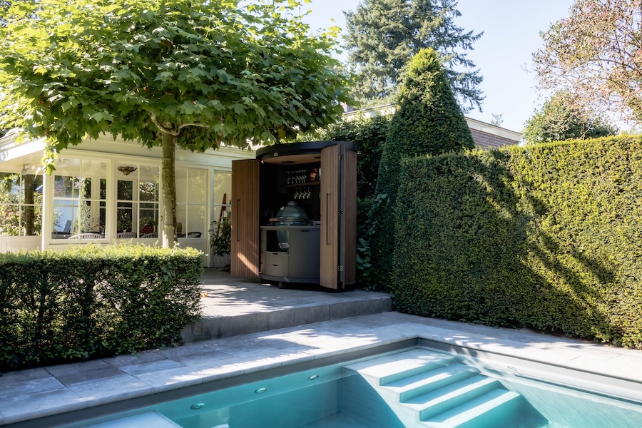 Dit nieuwe ontwerp is een luxe, volledig uitgeruste buitenkeuken, vormgegeven als een elegant tuincabinet. De naam verwijst naar de ronde, bolle vorm en imposante gestalte – een knipoog naar de beroemde Belgische stripheld Obelix. Toch is de kast verrassend compact. Met een breedte van 212 centimeter en een hoogte van 115 centimeter past het moeiteloos in een stadstuin of op een dakterras.