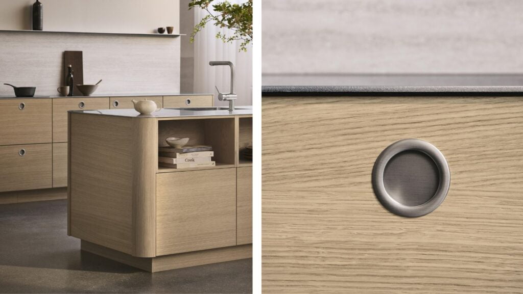 Kvik probeert het assortiment elk jaar te vernieuwen. Dit jaar lag de focus op soepele, organische vormen. “Dit verzacht de geometrie van de ruimte en geeft een vloeiende, natuurlijk esthetiek”, verduidelijkt Johnsen. Daarom lanceerde Kvik dit jaar de TUB handgreep. Een ronde uitsparing in de deur. Deze kan in de Veda keuken verwerkt worden, die door de nieuwe handgreep een heel andere uitstraling krijgt.