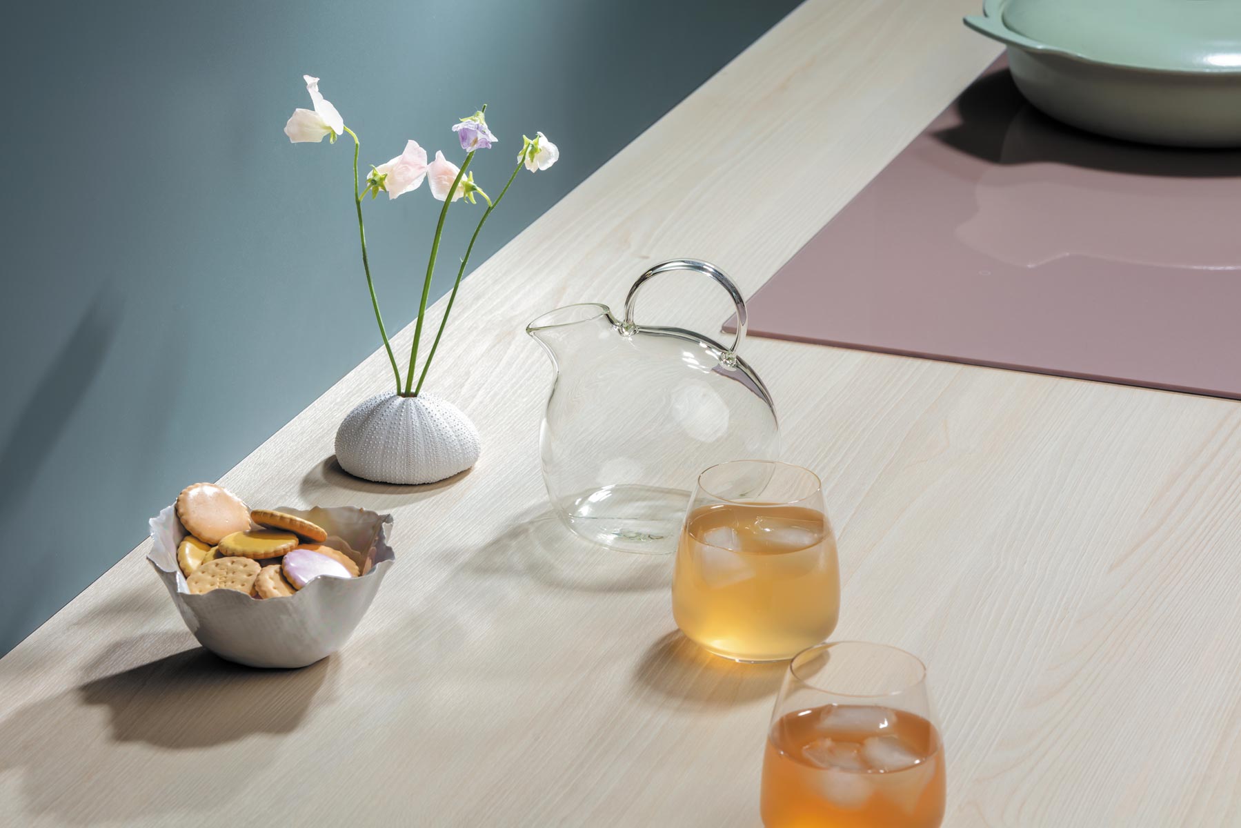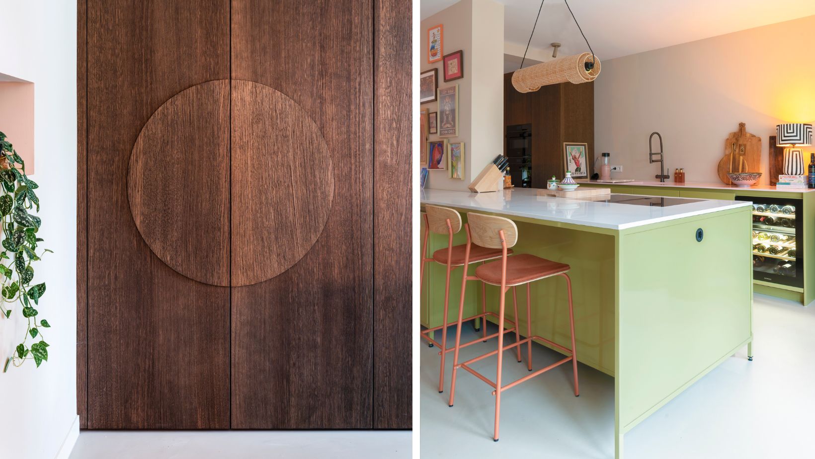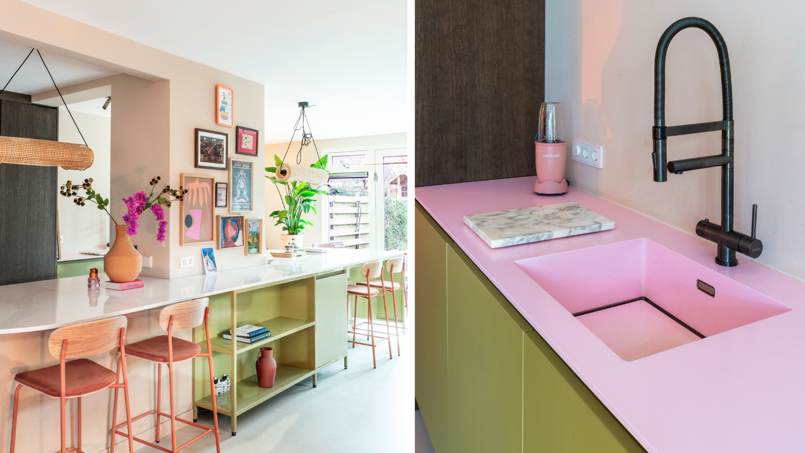 Dat lijkt in de keuken van Sheila van Kieveen in eerste instantie juist niet het geval. De wanden zijn poederzacht zalmroze, de kastfronten een naar het geel neigend olijfgroen en het werkblad met de spoelbak is juist knalroze. “En toch klopt het, dat is de kunst. Dat heeft Sheila ook benadrukt door bepaalde kleuraccenten, zoals dat roze, ook terug te laten komen in haar accessoires. Tegelijkertijd zijn er ook accessoires, zoals de lamp, die van natuurlijke materialen zijn gemaakt. En zo breng je weer een beetje rust in het totaalontwerp”, licht Danielle toe.