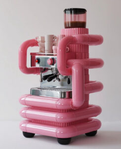 Tina Bobbe, productontwerper uit Dresden en academisch onderzoeker aan de TU Dresden, gebruikt AI als ontwerptool om espressomachines een geheel nieuwe uitstraling te geven. Haar creaties, de Pipe Frame en Pipe Frame Mini, bestaan uit speelse, felgekleurde buizen die van een alledaags koffiezetapparaat een sculpturaal kunstwerk maken.