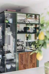 Op de begane grond lopen de lounge en de keuken met eetgelegenheid, naadloos in elkaar over. Een maatwerk coffeebar, voorzien van een tappunt met een heet waterkraan van Dornbracht, biedt een subtiele scheiding. De keuken bestaat uit een professionele horecakeuken waardoor de ruimte doet denken aan die van een restaurant.