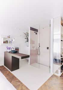 Zo gebruikt ze in de ensuite-badkamer de geurzuivering van Geberit. “Ik pas dit tegenwoordig toe in elk project. Binnen nu en 5 jaar denk ik, dat deze innovatie door iedereen standaard zal worden toegepast. Niet alleen de badkamer-ensuite, ook het gastentoilet van dit TOWNHOUSE heb ik ermee uitgerust.”