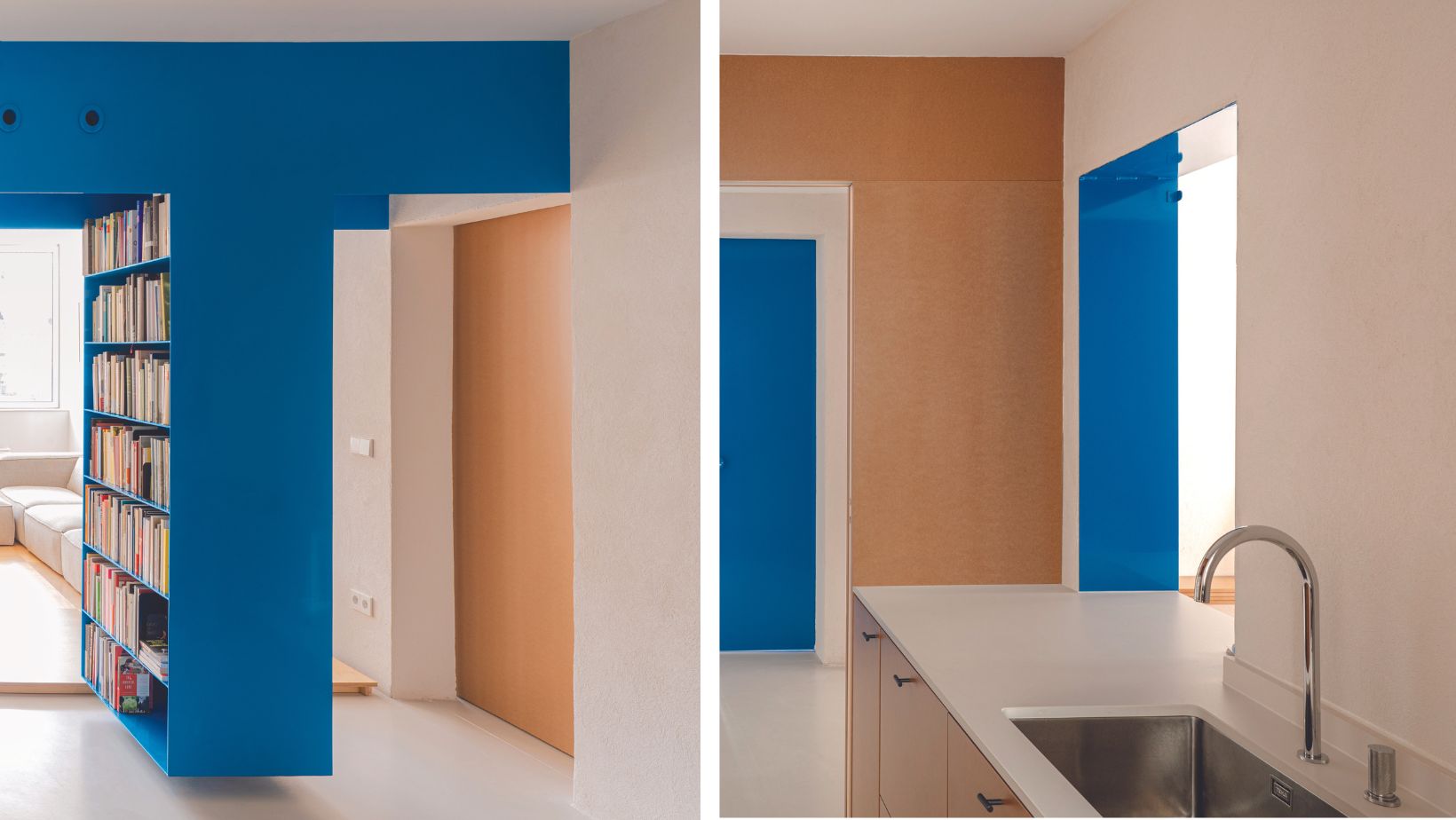 Ook in een tweede project van BURR Studio werd gekozen voor JUNG. In het House NN06-project komen de jaren ’60 op een bonte manier tot leven, met de kleur blauw in de hoofdrol. Een voormalig kantoor werd getransformeerd tot een leefruimte op een ietwat onconventionele manier. Zo werd het bestaande grondplan aangevuld met veel vrije ruimtes waardoor de indeling en het meubilair gemakkelijk veranderd kunnen worden. Daarnaast is het vooral de centrale T-vormige boekenkast die de show steelt. Deze is uitgevoerd in de blauwe tint die ook terugkomt in de boekenkast. Om schakelaars niet te laten opvallen, si hier gekozen voor de rustige, witte LS 990-schakelaars van JUNG.