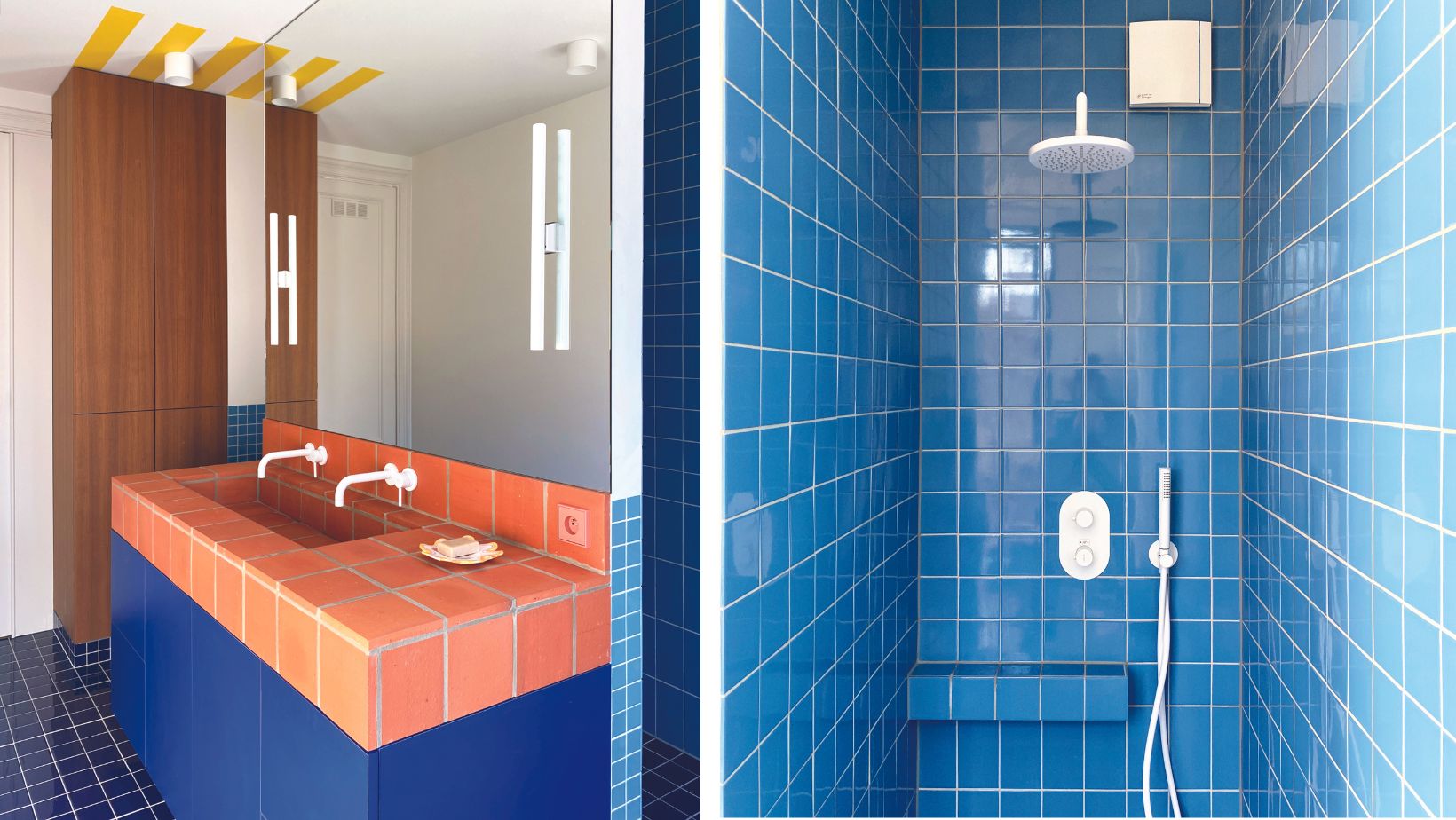 Het tegelwerk doet denken aan driedimensionaal Tetris. De hemelsblauwe tegels van de douche contrasteren met de ruwere terracottakleur van de wastafel. Er is gekozen voor LS 990-schakelaars van JUNG in dezelfde kleur – l’ocre rouge moyen – waardoor ze bijna volledig opgaan in het geheel. De badkamer heeft een haast identieke esthetiek als ‘La Piscine’ die bovendien een gezellige nostalgie uitademt.