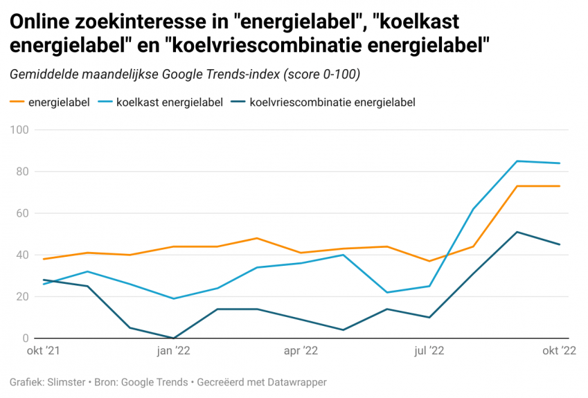 De Nederlandse consument zocht de afgelopen maand online ook veel op termen als ‘energielabel’ in het algemeen, ‘koelkast energielabel’ of ‘koelvriescombinatie energielabel’, zo laat Google Trends zien. Marvin Grouw, productspecialist witgoed bij Slimster, vermoedt dat consumenten eerst opzoeken welke energielabels er precies zijn en wat de verschillen zijn, voordat ze op vergelijkingssites of in webshops gaan filteren. “We zien bijvoorbeeld dat veel van onze bezoekers direct binnenkomen op een pagina over koelkasten met energielabel A. Voorheen zagen we vooral verkeer op pagina’s als ‘koelkast tot 500 euro of ‘ beste koop”, zo vertelt Grouw.