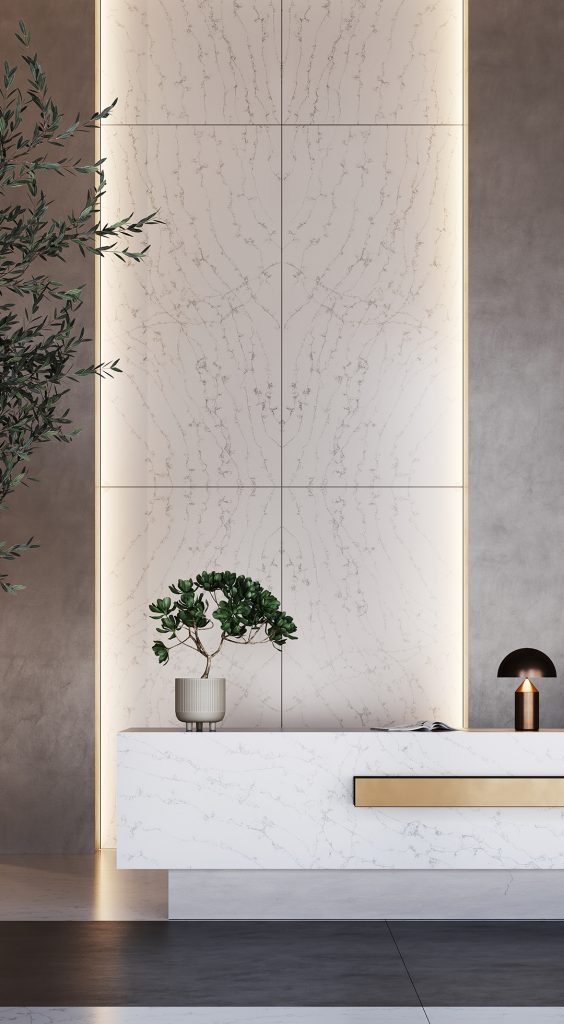 De nieuwste collectie gesinterd steen van Lapitec lijkt op marmer en heeft aderen die helemaal door het materiaal lopen. Een andere eigenschap is dat het materiaal helemaal vrij is van silica.