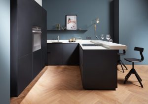 “Het L-vormige keukenblok bestaat uit een extra diepe onderkast van 66 cm en een ingebouwde bar. Het keramische aanrechtblad van Systemo in basaltino wit zorgt voor een licht accent op de donkere fronten. De heldere, horizontale lijnen bestrijken visueel de hele ruimte. Het hangende hoge kastenblok creëert extra ruimte en wordt ondanks de diepe kleur omgeven door een zekere luchtigheid.”
