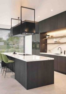 De zwarte afzuigkap is afgewerkt met licht doorschijnen glas, ingebouwde ledstrips en spotjes. De dimbare kookverlichting is regelbaar zodat de kleurintensiteit altijd past bij elke situatie.
