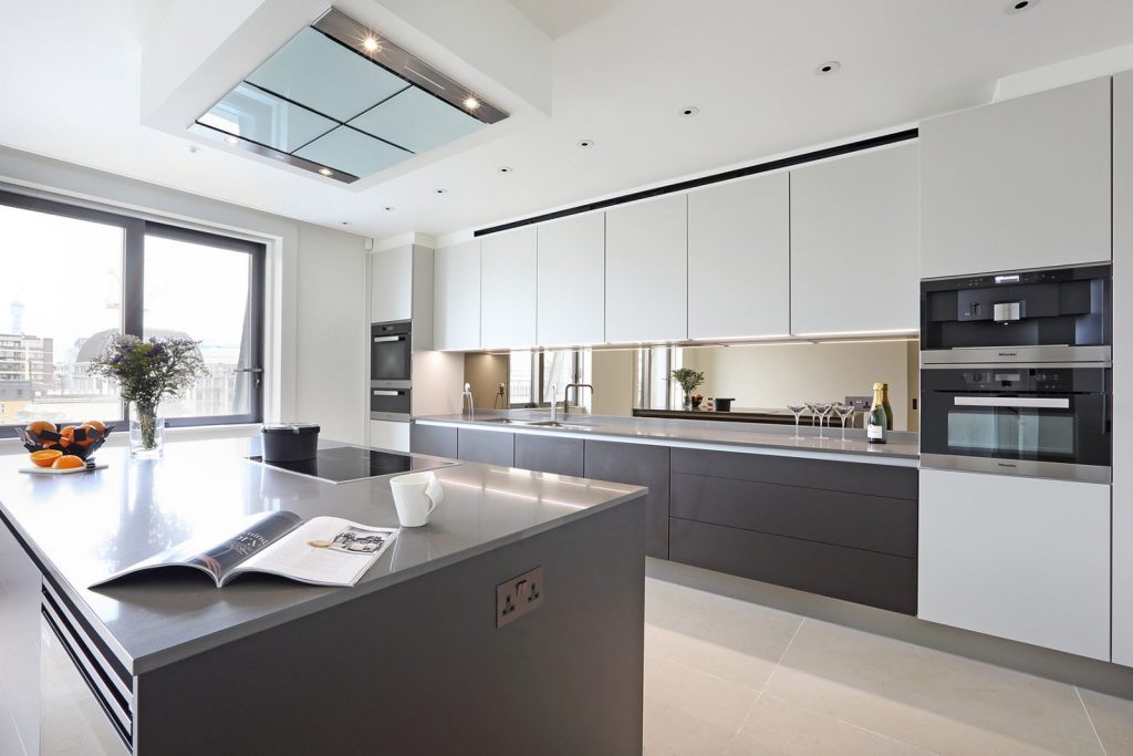 De designers van de Poggenpohl studio van Londen Wigmore Kitchens hebben moderne en strak gelijnde keukens voor het ‘Oceanic House’ ontworpen. De fronten zijn uitgevoerd in matlak kiezelgrijs en terra. Deze strakke keukens vormen een mooi contrast met de hoge gestuukte plafonds en antieke houten deuren van het historische pand.
