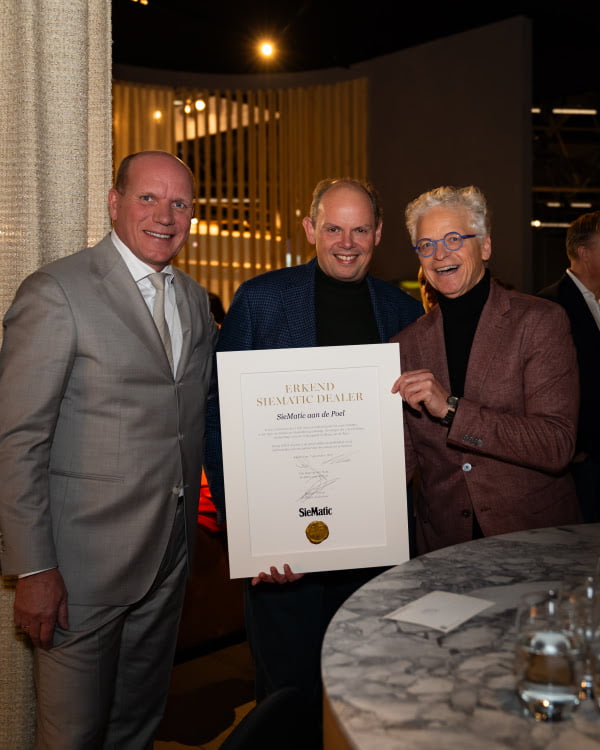 SieMatic past perfect bij Co van der Horst en de andere merken in de showroom in Amstelveen, stellen de heren tijdens de lancering van het nieuwe winkelconcept. Vanaf volgend jaar zullen alle ‘lifestyles’ van SieMatic, met een oppervlakte van maar liefst 500m2 op de eerste etage, het centrale punt vormen van de nieuwe woonwinkel.