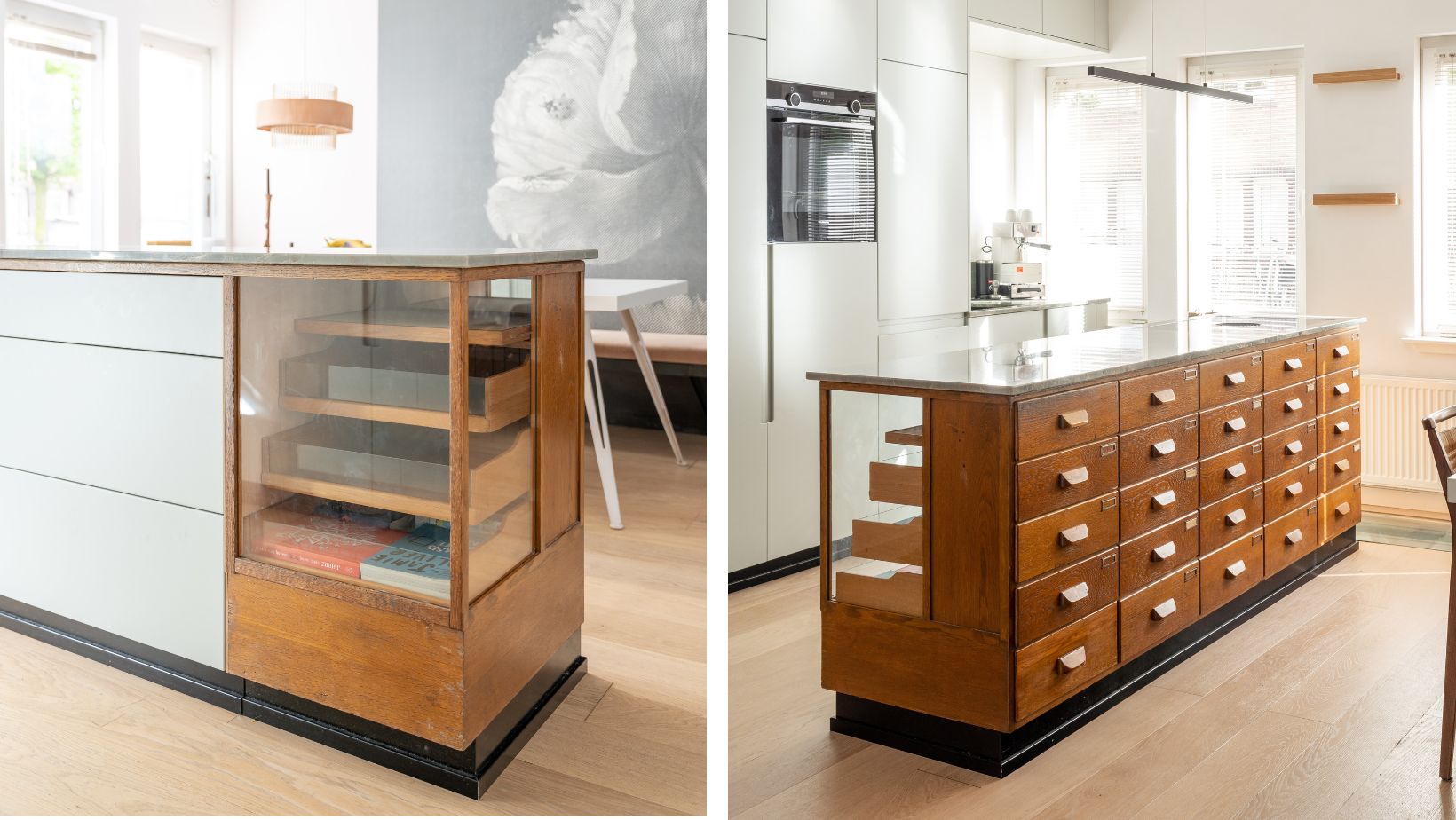 Een bijzonder project was de inrichting van een bestaande woning in Amsterdam. Cor licht toe: “Deze mensen hadden een keer een oude vitrinekast gezien, die was omgebouwd tot een keukenkast. Ze vroegen ons of wij zo’n kast in een eiland konden verwerken en er een BORA kookplaat in konden bouwen. We hebben duidelijk aangegeven aan welke eisen de kast moest voldoen. En uiteindelijk vonden de opdrachtgevers een vitrinekast, waaruit vroeger garen en ritsen werden verkocht. Deze hebben we in onze werkplaats helemaal uit elkaar gehaald en opnieuw opgebouwd.”