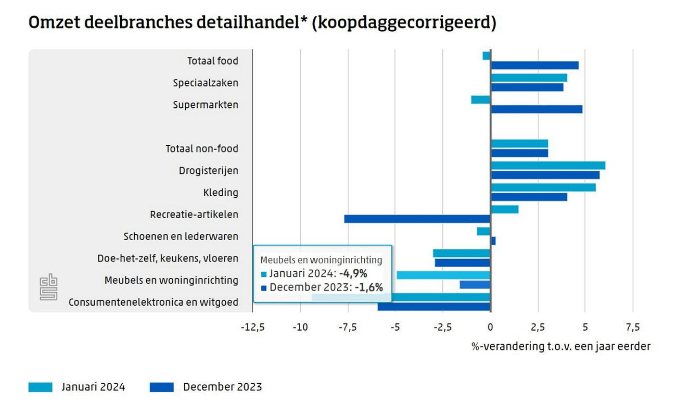 Helaas rapporteerden winkels in schoenen en lederwaren, doe-het-zelfzaken – inclusief keukens en vloeren (-3%), meubel- en woninginrichtingswinkels (-4,9%), en winkels in consumentenelektronica een daling in omzet voor januari.